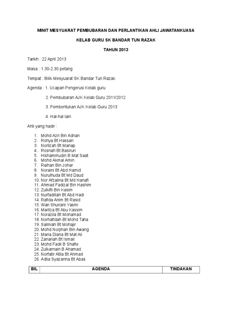 Jenis jenis contoh minit mesyuarat. Contoh penulisan minit mesyuarat untuk panitia bahasa melayu. Minit mesyuarat ahli jawatankuasa (ajk) pewaris prasekolah kali pertama 2011. Untuk memastikan perjalan pengurusan sekolah berjalan dengan lancar, mesyuarat perlu dilakukan. Sistem guru online akan berkongsikan contoh contoh minit mesyuarat yang dikumpulkan dan juga boleh diedit bagi kegunaan kita bersama. Senarai contoh minit mesyuarat terkini : Copyright savesave contoh minit mesyuarat for later. Pengesahan minit mesyuarat yang lalu tiada. Text of contoh minit mesyuarat ringkas. Sediakan sebuah minit mesyuarat hasil dari mesyuarat ajk pibg sebuah sekolah. Lantikan penyelaras bagi setiap tahun: Aku bersaksi bahwasanya tiada tuhan selain allah dan. Minit disediakan oleh setiausaha mesyuarat atau urus setia mesyuarat.