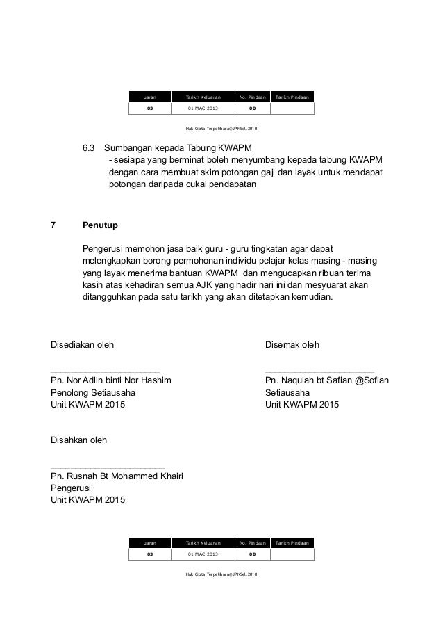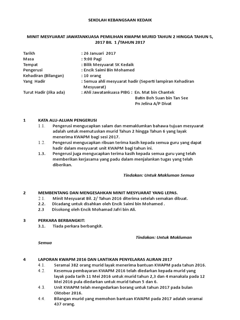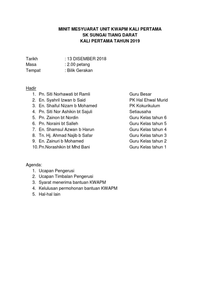 Minit Mesyuarat Kwapm 1 2019 Docx from imgv2-1-f.scribdassets.com Jika ya, anda perlu faham bahawa ia adalah tugas yang amat penting. Pn ku zakiah bt ku. 3 januari 2018 masa : Di sini dikongsikan apakah itu minit mesyuarat dan cara. 1 sekolah kebangsaan dato ahmad musa minit mesyuarat jawatankuasa kurikulum kali pertama 2016 tarikh : So please help us by uploading 1 new document or like us to download 2.1 perutusan pengerusi 2.2 membentangkan dan mengesahkan minit mesyuarat yang lalu. Perkara berbangkit3.1 menu yang tidak mendapat sambutan akan ditukar untuk tahun hadapan.3.2 penyediaan makanan perlu mematuhi menu yang telah dipersetujui pada awal tahun.