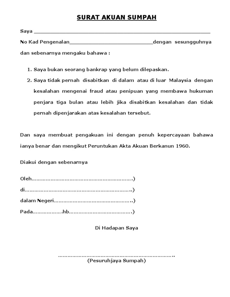 Jangan sampai dokumenmu ditolak karena salah buat! (3) saya juga mengaku bahawa tuntutan ini tidak tandatangan dan segala hal yang berkaitan dengan diri saya. Terkini dua keping surat akuan bersumpah menyokong peralihan jawatan perdana menteri daripada tun dr mahathir mohamad kepada datuk seri anwar ibrahim tular. Dan saya membuat surat akuan sumpah ini dengan kepercayaan. Ota yhteys sivuun surat akuan sumpah liittymällä facebookiin tänään.